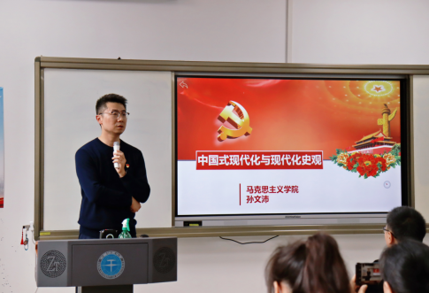 大会第二项,副经理孙文沛同志进行题为《中国式现代化与现代化史观》的主题党课讲授(如图四)。孙文沛教授从五个方面介绍中国式现代化的五大特征,除此之外,孙文沛教授还介绍了现代化史观以及现代化新论,强调要深入学习和牢牢把握现代史观,应该追寻历史,拷问现实,持续努力建设社会主义现代化强国。
