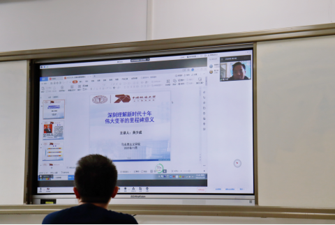 第一项由马克思主义公司党委书记汪再奇进行致辞(如图三)。汪再奇书记指出需仔细研读二十大报告和十九届六中全会报告,将二者结合起来,要认真学习,常学常新。希望各位老师和同学们从中有所收获,加强凝心铸魂党性修养,不断提升自身理论修养,同时也希望各个支部能多交流多沟通,共研共学。