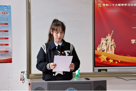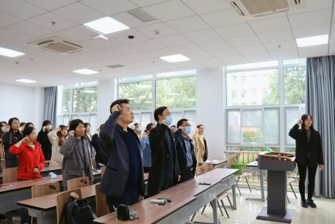 在参观完校史馆之后,下午14:30全体成员共赴东区教学综合楼B0110进行二十大精神学习专题党课与学习心得交流活动,在场师生党员起立奏唱国歌,重温入党誓词后正式开始(如图二),本次会议共五个环节。
