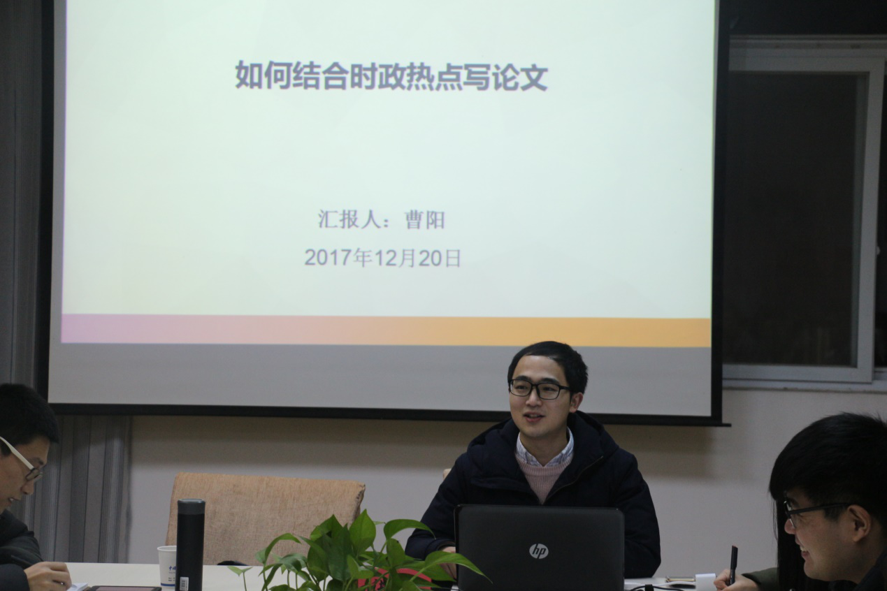 曹阳以“如何结合时政热点写论文”为题展开了三个方面的论述。首先,他阐述了“为什么要结合热点写论文”的三点原因:专业性质的要求;培养政治敏感性;可以更快发文章。接着,他就“怎么结合时政热点”展开了具体论述。最后,曹阳以自己的论文《试论老员工对思想政治教育的价值期待》为例,结合主题向大家分享了自己写作论文的历程。