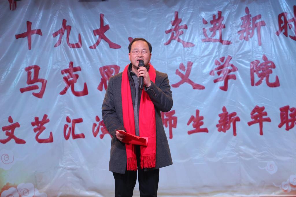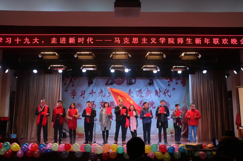第一轮新年师生抽奖结束后,大一新生带来独唱《岁月神偷》,向大家展示她的完美歌喉,赢得大家的点赞;思政系老师集体带来《太阳最红毛主席最亲》的合唱,让现场观众都情有所感,陶醉其中;接着,研究生带来的动感舞蹈向全场彰显了她们的青春活力;德育教研部老师们演唱的《中国人民解放军军歌》或优美动听,或饱含深情;研究生马理班带来的话剧《恰同学少年》,彰显了新一代老员工有理想、有斗志的形象。