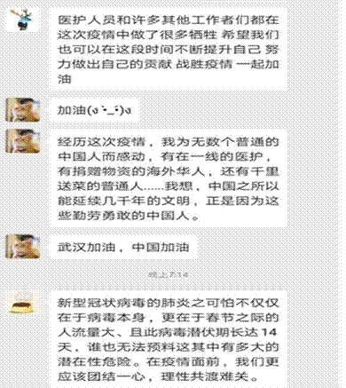 为进一步加强支部团员青年积极参与防控疫情的责任意识,增强战胜疫情的决心,助力国家、社会和公司打赢疫情防控阻击战,2020年2月21日,2019级马克思主义理论团支部开展了以“抗击疫情 传递温暖”为主题的线上团日活动。此次团日活动中,支部成员以宿舍为单位,各宿舍以线上视频及线上讨论的形式进行互动学习。