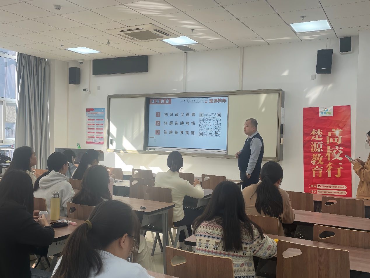 本次活动邀请到了楚源教育的首席面试官诸葛清老师和成功上岸武汉市选聘生的优秀员工魏运军为同学们作了精彩的指导与分享。