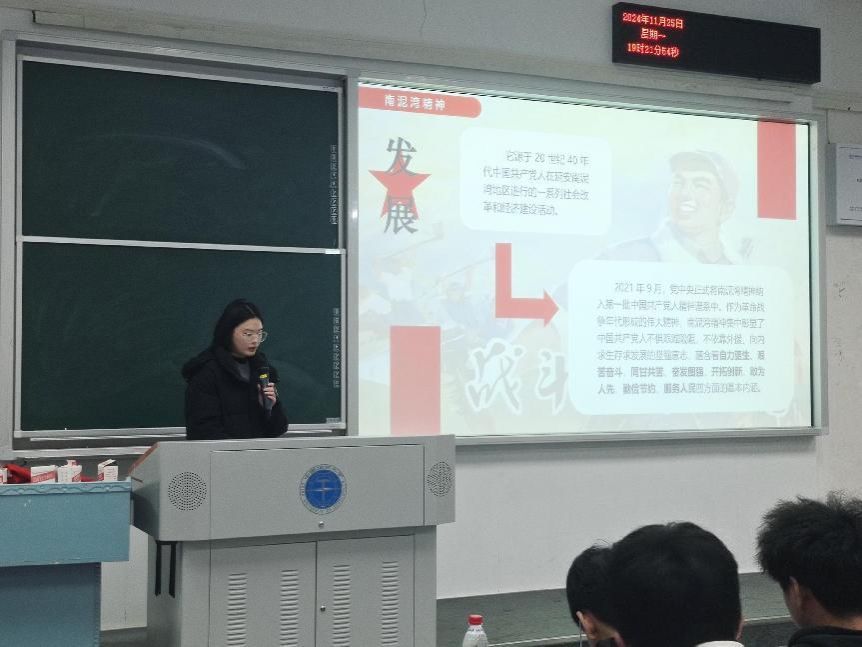 最后,王碧菲带大家学习第四部分南泥湾精神的现代传承,我们要做到以史鉴今,继往开来,面对任何艰难险阻,中国人民有决心、有能力、有办法走出自己的道路。每一个时代的青年人都面临着不同的风险和挑战,更肩负着国家的使命和担当,我们每一个人都绝不能独善其身,都应该坚定成为南泥湾精神的传承者,成为新时代的“拓荒者”,以自力更生,艰苦奋斗,脚踏实地,实干创业来要求自己,在时代的新征程书写下自己的故事,共创祖国的辉煌。