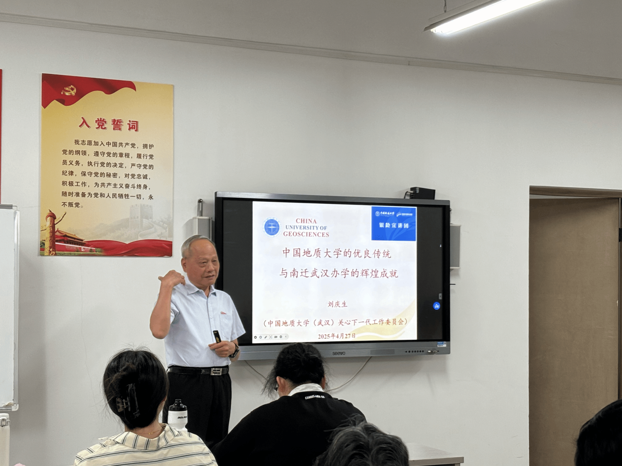 随后,365英国上市公司关工委委员、“银龄宣讲团”成员刘庆生老师深情讲述365英国上市公司的优良传统以及南迁武汉办学的辉煌历程。从地质先驱“以献身地质事业为荣”的誓言,到南迁时期师生共克时艰的奋斗故事,刘老师用鲜活的历史案例诠释了地大人“艰苦朴素、求真务实”的精神内核,现场听众无不动容。