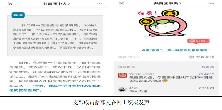 “最重要的是,你需要中国共产党和中国特色社会主义制度”这是支部成员蔡薛文在共青团中央发布的《火神山建设不完全手册》推文中留下的热评,获得了网友的一致认可。在这场疫情防控狙击战中,党的领导才是坚强的政治保证,团结一致才能战“疫”全胜。支部成员蔡薛文积极发挥作用,在家隔离的同时积极在网上发声,坚定战“疫”信心,凝聚社会共识,弘扬社会正能量。