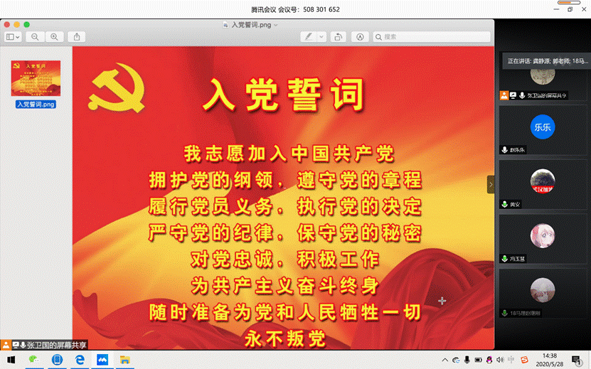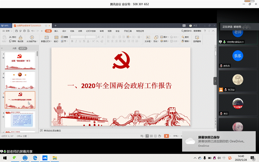 为了引领党员聚焦两会,认真学习贯彻落实“两会”精神。2020年5月28日下午2点30,政治理论教研部党支部、2018级马克思主义理论硕士生党支部在腾讯会议平台上召开学习全国“两会报告”会议。张卫国老师、郭关玉老师主持会议。