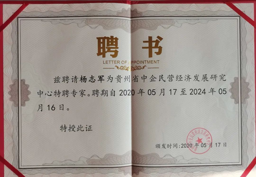 始于教书育人却不止步于此,杨志军员工也积极为地区建设及地区经济发展建言献策。2020年5月,杨志军员工被聘为贵州省中企民营经济发展研究中心特聘专家,其作品《建设高素质强大人才队伍打造高水平创新型省份的建议》于2021年10月在“我为强省会建言献策”征文大赛中获一等奖。