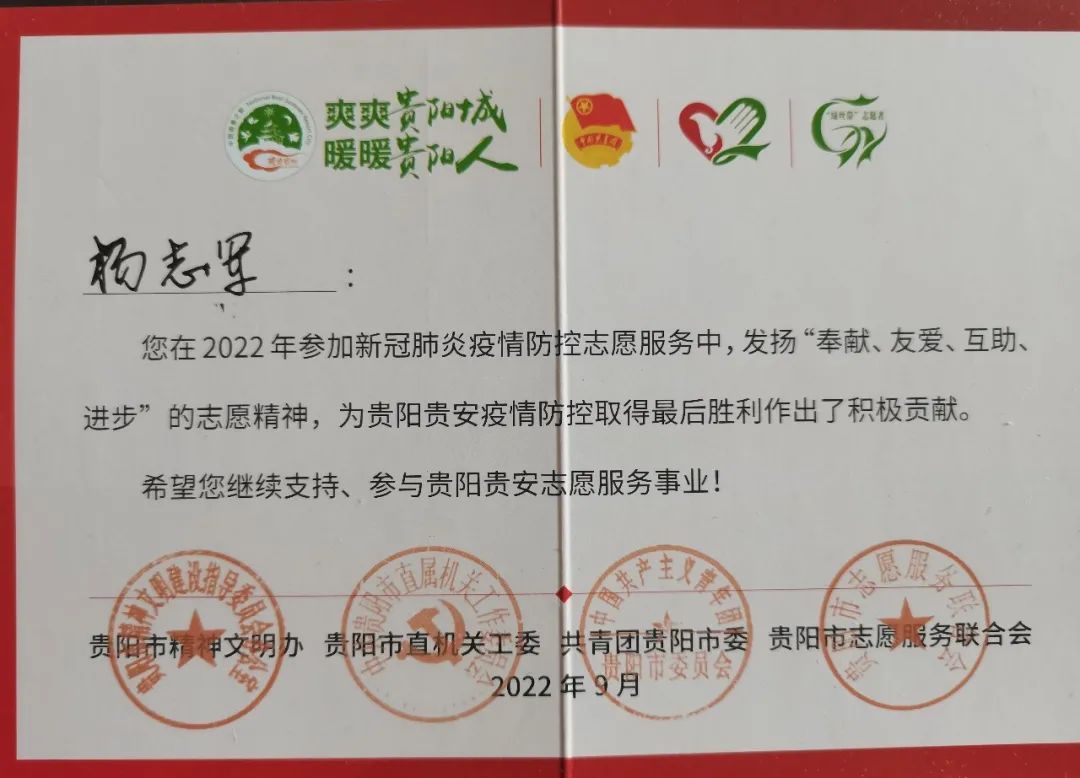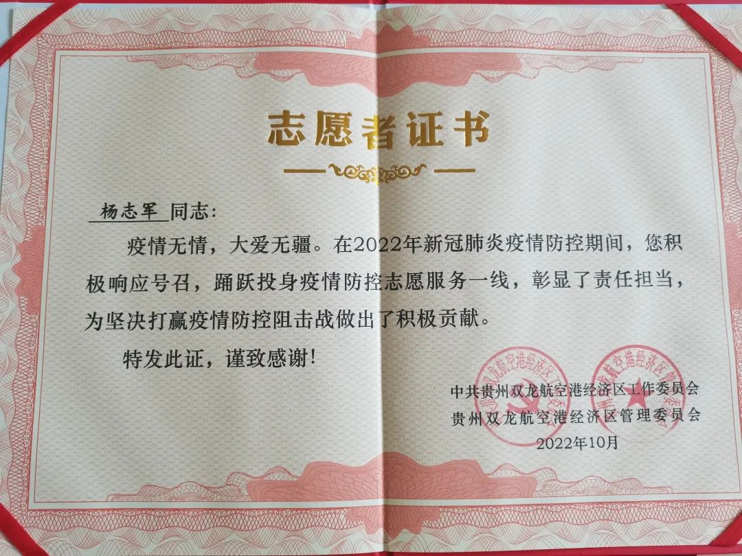 疫情期间,杨志军员工作为志愿者在贵阳公司家属区服务,积极为社区疫情防控做贡献,为人民生命财产安全保驾护航。